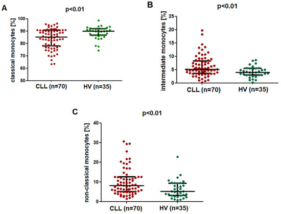 Classical monocytes were the most numerous among the CD14+ monocytes, both in the control group and the study group (Figure 2A). The percentage of classical (CD14+CD16−SLAN−) monocytes was significantly lower in CLL patients (median; IQR), at 85.37 (77.98–90.69%), as compared to the control group (median; IQR), with a percentage of 90.06 (86.69–92.00%) (p < 0.01) (Figure 2A). On the contrary, the percentage of CD14+CD16+SLAN− intermediate monocytes was significantly higher in CLL patients, at (median; IQR) 5.18 (3.62–8.30%) as compared to 4.05 (2.96–5.48%) in healthy volunteers (p < 0.01) (Figure 2B). Similarly, in the group of CLL patients, a significantly higher percentage of CD14dimCD16+SLAN+ non-classical monocytes (median; IQR), namely 8.19 (5.11–12.61%), was found as compared to that of the control group (median; IQR), 5.20 (3.10–9.27%) (p < 0.01) (Figure 2C).