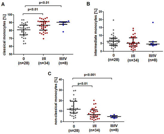 Comparison of the percentage of (A) classical, (B) intermediate and (C) non-classical monocytes in CLL patients at different stages of disease advancement. The solid line marks the median value. Ɪ represents the interquartile range (IQR).