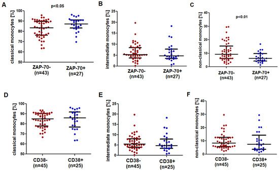 Comparison of the percentage of (A,D) classical, (B,E) intermediate and (C,F) non-classical monocytes in CLL patients ZAP-70-positive and ZAP-70-negative and CD38-positive and CD38-negative group. The solid line marks the median value. Ɪ represents the interquartile range (IQR).
