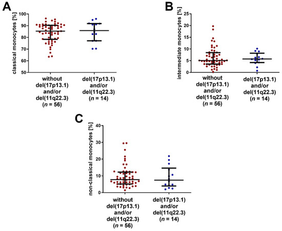 The percentages of classical, intermediate and non-classical monocytes were compared between the groups of patients with and without the negative cytogenetic aberrations del(11q22.3) and/or del(17p13.1). No significant differences between those groups were noted (Figure 5A–C).