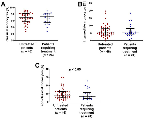 The percentage (A) classical, (B) intermediate and (C) non-classical monocytes in the group of CLL patients requiring treatment and in the group of patients not requiring antitumor treatment. The solid line marks the median value. Ɪ represents the interquartile range (IQR).