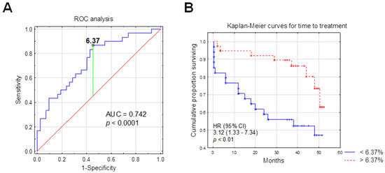 The statistical analysis was carried out using Statistica 13.0 software (StatSoft, Cracow, Poland). The GraphPad software version 5.0 (GraphPad Software, San Diego, CA, USA) was used for the graphic presentation of the obtained results. For data description, the median and interquartile range (IQR: 25% percentile and 75% percentile) were used. The Mann–Whitney U test was used to compare two independent groups, Wilcoxon’s pairwise test was used to compare related variables within groups, and Spearman’s rank correlation test was used to assess the dependence between the variables. The ROC (Receiver Operating Curve) graphs were used to determine the optimal cut-off points that could be a prognostic factor for the time-to-treatment-initiation. The Kaplan–Meier analysis was used to assess the probability of the need to start cytostatic treatment. The log-rank test was used to assess the difference in time from disease diagnosis to time-to-treatment (TTT) between groups. Cox regression analysis was constructed to determine the hazard ratio (HR). The level of significance was set at p-value ≤ 0.05.