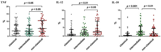 Percentage of classical (CD14+CD16−SLAN−), intermediate (CD14+CD16+SLAN−) and non-classical monocytes (CD14dimCD16+SLAN+) assessed for intracellular expression IL-10, TNF and IL-12 in “ex vivo” conditions. The solid line marks the median value. Ɪ represents the interquartile range (IQR).