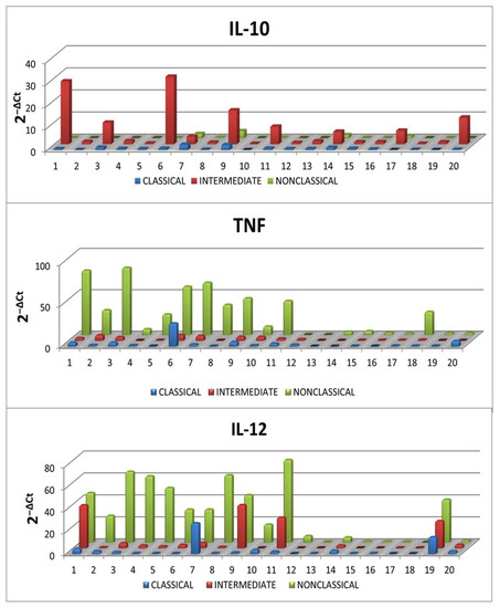 IL-10, TNF and IL-12 expression levels measured by flow cytometry were confirmed with RT-qPCR. The mRNA levels for IL-10, TNF and IL-12 in classical, intermediate and non-classical monocytes were consistent with the results obtained by flow cytometry (Figure 9).