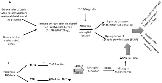 The immune system consists of a set of molecules and cells that are organized in tissues and organs while functioning close interacting to generate a protective response against invaders. Two components of immunity are recognized: innate and adaptive. The former recognizes pathogen-associated molecular patterns [1] and activates unspecialized cells to produce pro-inflammatory and regulatory cytokines, which function to mediate effector adaptive mechanisms via effector cells of adaptive immunity (Th1, Th2 Treg, and B cells) [2,3]. The role of adaptive immunity in neurodevelopmental disorders is supported by alterations in T- and B-cell subsets and (auto)antibody levels in the blood, cerebrospinal fluid (CSF), and brain tissues, during disease [2,3]. These cells cross the blood–brain barrier and secrete cytokines dependent upon the type of target antigen recognized in central nervous system (CNS) by antigen-presenting cells (APCs). T cell subtypes secrete variable cytokines that counter-regulate each other [4], and an imbalance between pro- and anti-inflammatory pathways is seen that plays an important role in the pathogenesis of neuropsychiatric disorders such as autism [3,5,6].