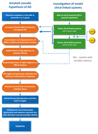 Today, the properties of D- and L-optical isomers of amino acid residues in proteins and peptides are in the focus of interests of scientists in various specialties. The source of this interest is associated with the fact that one of the main causes of neurodegenerative diseases (Alzheimer’s, Parkinson’s, and some others) is due to the replacement in certain proteins and peptides of L-amino acids to D-analogs, which occurs during aging [1,2]. It is these proteins and peptides are believed to undergo disruptions in folding processes, such as aggregation resulted in the formation of large oligomers and fibrils that are highly toxic, especially, for the brain cells [3,4]. So, β-amyloid (Aβ42), a 39–42 amino acid polypeptide found in the brain, being present in a high concentration in the central nervous system, penetrates the membranes of astrocytes, forming special channels through which it affects the level of extracellular calcium [5,6]. Aβ42 also changes the mitochondrial potential of cells (astrocytes and microglia), produces toxic ROS, and indirectly, through intercellular exchange with astrocytes, causes neuronal death [6,7,8]. For example, the so-called “amyloid” hypothesis of the origin of the disease associated with the complete destruction of the psyche—dementia, widely represented in the literature, is shown in Figure 1. The processes mentioned above with the participation of Aβ42 are marked in the diagram by orange color.