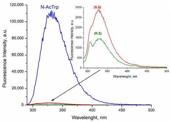 In this case, stereoselectivity was observed in fluorescence quantum yields φSS/φSR = 2 (Figure 3). Despite the report of some differences in the quantum yields of (R,S)- and (S,R)-enantiomers [20], the inaccuracy in determining the quantum yields of enantiomers is probably due to the very small amount of free tryptophan in the dyad. Thus, careful analysis of CIDNP effect and fluorescence quenching allowed one to detect stereoselectivity and difference in the CIDNP enhancement coefficients (spin selectivity) of intramolecular electron transfer in diastereomers of dyads with L- and D-tryptophan.