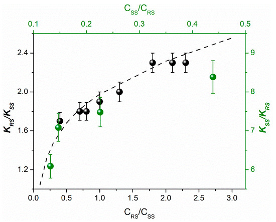 The experimental dependence of the observed ratios of CIDNP enhancement coefficients and calculated values (dash line) on (R,S)-diastereomer concentration for dyads IV (black balls, CSS = 1 mM) and II (green balls, CSS = 2 mM) [14,20].