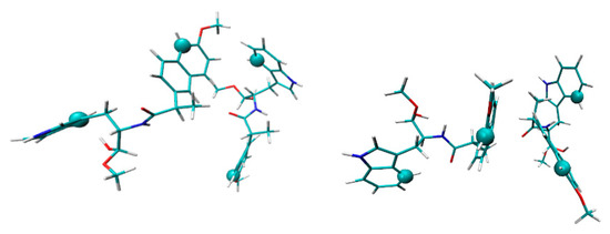 The approach of two molecules of (S,S)-diastereomer of dyad I, forming a different types of dimers: approach of a NPX fragment with Trp (left) and two NPX residues (right). The distance between atoms marked by spheres was analyzed [20].