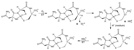 New information about the factors governing CI can be gleaned from studies of metallopeptides, considered as close analogues of metalloproteins [30,31,32,33,34]. The effect of the transition metals Co (II), Co (III), Cu (II), and Ni (II) on the racemization of chiral systems was established long ago [30]. Currently, metallopeptides are positioned as devices for biotechnologies, such as drug delivery vehicles, substance for increased site-specific modification of proteins, etc., as well as models for the study of metal-containing enzymes. So, Ni-asparagine-cysteine-cysteine is considered an analogue of superoxide dismutase and it is often used to simulate elementary biological reactions [31]. It has been shown that the binding of peptides to transition metals noticeably increases its reactivity. In the work [31], in particular, catalysis of CI in the Ni2+-asparagine-cysteine-cysteine metallopeptide (NiAsCC) by molecular oxygen was studied. Authors of [31], using a set of physicochemical methods, including CD, electron absorption spectroscopy, ESR, and chemical scavenging have detected the formation of several short-lived intermediates, such as a carbanion with a pro-chiral carbon atom, superoxide, the O2−• anion, two more carbanions, and traces of the complex with Ni3+. In this case, the CI product is the D-isomer of the Ni2+ containing peptide. This allows authors of this review to assume the participation of radical steps in CI of Ni-asparagine-cysteine-cysteine complex. The possible scenario might be the following. The catalyzer—oxygen oxidizes Ni2+ to Ni3+ state, simultaneously turning into O2−•. The latter withdraws alpha proton from the chiral center in NiAsCC leading to the formation of the HO2• radical and a pro-chiral carbanion. During the back attachment of the proton from the medium to the carbanion optical configuration of NiAsCC changes (CI). Then Ni3+ is reduced to Ni2+ under the action of HO2• radical (Figure 9).