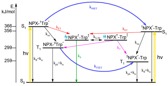According to the CIDNP and fluorescence data, the scheme of photoinduced processes in dyad I is as follows (Scheme 1). Upon photoexcitation the singlet excited state of chromophore is formed, then ET may occur both from Trp in ground state to 1NPX* in singlet excited state and from singlet excited state of 1Trp* to NPX in ground state resulted in formation of BZ. The fraction of light absorbed by amino acid and drug molecules depends on excitation wavelength. In CIDNP experiments λexc = 308 nm and all light is absorbed by NPX (97%), at λexc = 300 nm in fluorescence experiments 40% of light is absorbed by Trp and 60% by NPX. From experimental data, the rate of back ET from triplet spin state (kT) of BZ was established to be higher than from singlet (kS). In addition, the singlet 1Trp* and triplet 3Trp*excited states are quenched via singlet-singlet (SSET) and triplet-triplet energy transfer (TTET), correspondingly. In essence, photoinduced processes related with CIDNP formation are limited by the right part of the scheme that describes 1NPX* quenching (Scheme 1).