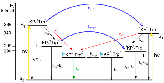 Photoinduced processes in dyad II. The ratio of light absorbed at λexc = 308 nm by KP/Trp is 55/45, at λexc = 280 nm 65/35. This scheme is similar to the case of dyad I, the difference is that back ET is allowed only from the singlet spin state of BZ. As appears from above, when discussing the CIDNP effects, only the left part of photoinduced processes should be considered.
