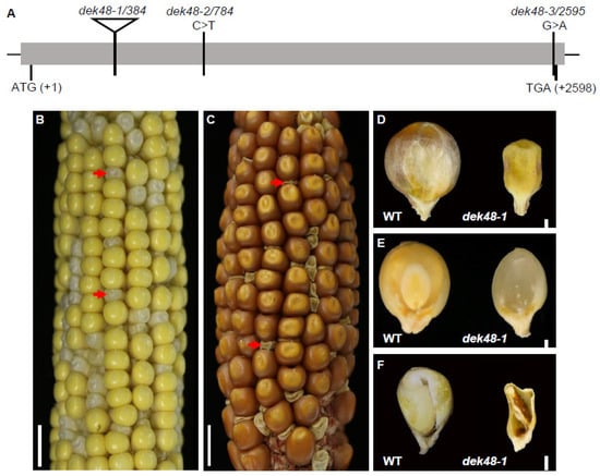 Phenotypic characterization of dek48-1 kernels. (A) Schematic structure of the Dek48 gene and positions of Mutator (Mu) insertions. The Mu insertion site of dek48-1 and point mutation sites of dek48-2 and dek48-3 are shown in detail. (B) A segregating ear of dek48-1/+ maize at 12 days after pollination (DAP). Arrows point to dek48-1 mutant kernels. (C) Mature ear of self-pollinated dek48-1 heterozygotes. Arrows point to dek48-1 mutant kernels. (D) Embryo side of mature kernels of wild-type (WT) and dek48-1 kernels. (E) The embryo and endosperm of WT and dek48-1 kernels at 12 DAP. (F) Dissection of mature WT and dek48-1 kernels along the embryo axis. Scale bars = 1 cm in (B,C); 1 mm in (D–F).