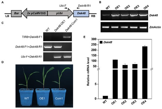To further confirm the dek48 phenotype is caused by the disruption of GRMZM2G017197, we created transgenic lines overexpressing Dek48. The full-length ORF of Dek48 was cloned into the pUNTF binary vector under the maize ubiquitin1 promoter (Figure 3A). The overexpression of transgenic plants (Dek48-OE) was obtained via Agrobacterium tumefaciens transformation of the KN5585 inbred line. Four independent lines (Dek48-OE1 to OE4) were generated. RT-PCR and qRT-PCR results show a high level of Dek48 expression in these transgenic plants compared with WT (Figure 3B,E). We crossed Dek48-OE1 with dek48-1/+ heterozygotes to generate the F1 progenies. The plants containing Dek48-OE1 transgene and Mu insertion were selected and self-pollinated. Homozygous for dek48 harboring, the Dek48 transgene was identified in the seedlings of F2 progeny, indicating that Dek48-OE1 rescues the embryo lethal phenotype of dek48-1 (Figure 3C,D). These results confirm that the dek48 phenotype is caused by mutation of the GRMZM2G017197 gene, hereafter referred to as Dek48.