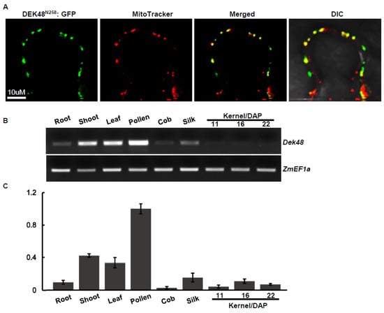 To determine the subcellular localization, we fused the full-length DEK48 with green fluorescent protein (GFP) at an N–C orientation under the control of the 35S CaMV promoter in the pGWB5 vector. The fusion was transiently expressed in tobacco epidermal cells using the Agrobacterium infiltration. No signals were detected. We speculate that this might be due to poor expression of the full-length DEK48, as it was frequently detected in such proteins [8,37]. Then, we fused the N-terminal 258 amino acids of DEK48 to GFP in the pGWB5 vector to generate the DEK48N258-GFP fusion. When expressed in tobacco cells, strong green fluorescence signals were detected in dots that were merged with the red fluorescence signals of mitochondria marked by the MitoTracker (Figure 5A). This result indicates that DEK48 is targeted to mitochondria.