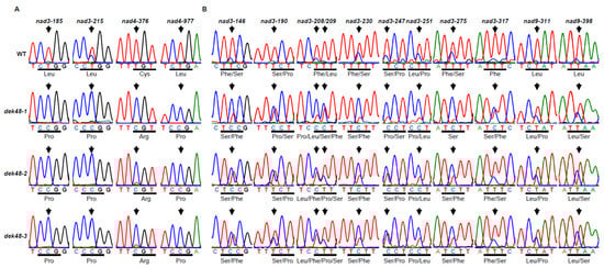 Previous studies showed that most PPR-DYW proteins are involved in C-to-U editing in plant organelles [7,38,39]. To uncover the function of DEK48, we analyzed the transcripts of 35 mitochondrion-encoded genes between WT and dek48-1 by RT-PCR. The nearly full-length cDNAs were amplified from WT and dek48-1 kernels in the same ear at 12 DAP. We analyzed the editing efficiency by direct sequencing of these PCR amplicons. Results show that the C-to-U editing at the nad3-185, -215 and nad4-376, -977 sites was completely abolished (Figure 6A), and the editing at eleven other sites (nad3-146, -190, -208, -209, -230, -247, -251, -275, -317 and nad9-311, -398) was substantially decreased in dek48-1 compared with in WT (Figure 6B). Analysis of dek48-2 and dek48-3 showed similar results at all fifteen sites, except that dek48-1 is more severe.