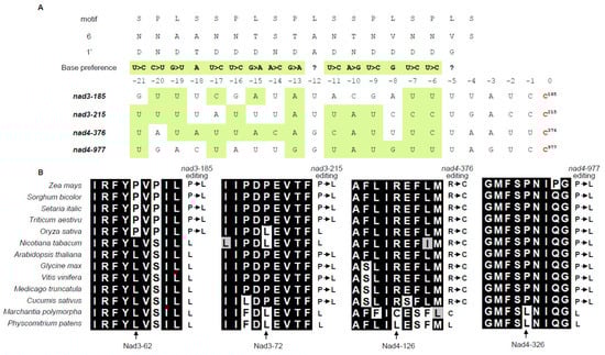 PPR proteins bind to RNA substrate in a sequence-specific manner, where target sequence is recognized by amino acid residue combination at the sixth and next 1′ position of the PPR motif [40,41]. Based on this code, potential binding sites of DEK48 were predicted. Results show that the nucleotides upstream of nad3-185, -215 and nad4-376, -977 sites are well-aligned to the combinatorial codes (Figure 7A). The abolished editing in dek48-1 alters the encoded amino acid from Leu (CUG)62 to Pro (CCG)62 and Leu (CUG)72 to Pro (CCG)72 in nad3, and Cys (UGU)126 to Arg (CGU)126 and Leu (CUG)326 to Pro (CCG)326 in nad4 (Figure 6A). Alignment of genomic DNA sequences of nad3 and nad4 orthologs indicated that these four amino acids were highly conserved from Physcomitrium patens to mono- and eudicotyledonous species (Figure 7B), implying that these residues are probably important to the function of Nad3 and Nad4.