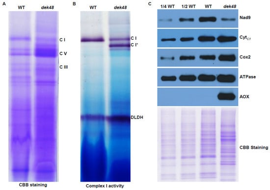 Nad3 and Nad4 are the core subunits of mitochondrial complex I, an entry point of the oxidative phosphorylation (OXPHOS) pathway [42,43]. To assess the impact of the Dek48 mutation, we analyzed the assembly of complex I and its NADH dehydrogenase activity by blue native polyacrylamide gel electrophoresis (BN-PAGE) and in-gel NADH dehydrogenase activity staining. As shown in Figure 8A, Coomassie brilliant blue (CBB) staining showed that the abundance of complex I was drastically decreased in dek48-1 compared with the WT, whereas complex III and V were increased. The in-gel NADH dehydrogenase activity assay showed a similar decreased activity of complex I in dek48-1 (Figure 8B). Two bands smaller than complex I were detected and showed NADH dehydrogenase activity (Figure 8B), suggesting potential blocked sub-complexes of complex I in the assembly process. These results suggest that the loss of DEK48 function inhibits the assembly of complex I. Furthermore, we employed Western blotting to examine the protein abundance of mitochondrial complexes by specific antibodies against Nad9 (a subunit of complex I), CytC1 (a subunit of complex III), Cox2 (a subunit of complex IV), and ATPase (α subunit of complex V). Results show the abundance of Nad9 was decreased in dek48-1, whereas the levels of CytC1, Cox2, and ATPase were slightly increased (Figure 8C). This result is consistent with the BN-PAGE analysis.