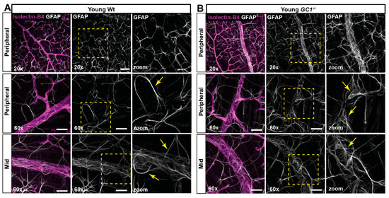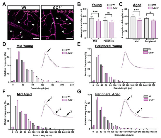 2.2. Retinal Vessel Branches Are Shorter in Aged GC1−/− Mice