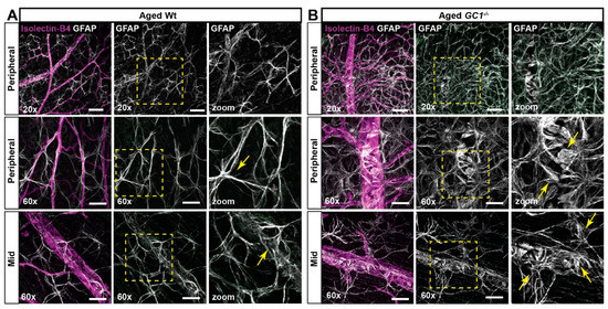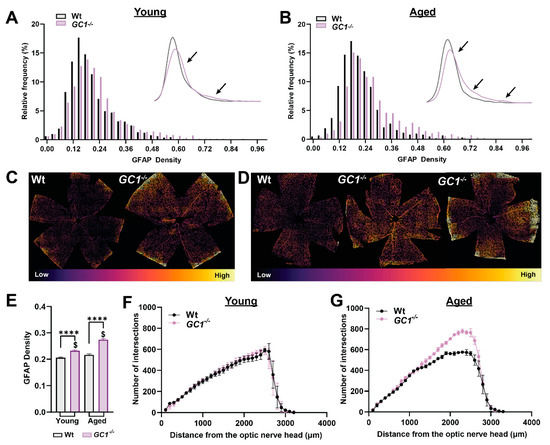 - Mansour, H.; Chamberlain, C.G.; Weible, M.W.; Hughes, S., II; Chu, Y.; Chan-Ling, T. Aging-related changes in astrocytes in the rat retina: Imbalance between cell proliferation and cell death reduces astrocyte availability. Aging Cell 2008, 7, 526–540. [Google Scholar] [CrossRef] [PubMed]