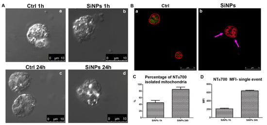 Isolated mitochondria of U937 cells incubated for 1 or 24 h with SiNPs. (A) Representative brightfield images of isolated mitochondria from controls (1 h and 24 h, a and c) and NP-treated cells (1 h and 24 h, b and d). Scale bar = 10 µm. (B) Representative fluorescent merged confocal images of isolated mitochondria from control (a) and NP-treated cells (b) for 24 h and then stained with LTG (green) and TMRE (red). Yellow/green and violet indicate colocalization (highlighted in treated cells from violet arrows). Scale bars: 25 µm. (C) Histogram of flow cytometry data indicating percentage of SiNPs positive cells after 1 h and 24 h of incubation. (D) Histogram of flow cytometry data which illustrate mean fluorescence intensity (MFI) of SiNPs within isolated mitochondria of U937 cells after 1 h and 24 of treatment. At least 10,000 events were analyzed by flow cytometry for each experimental condition.
