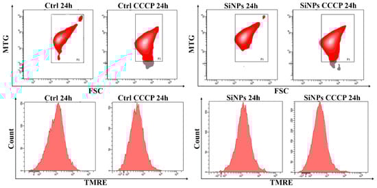 SiNPs uptake study of U937 isolated mitochondria and mitochondrial mass investigation. Sequence of analysis by flow cytometry of MTG staining of isolated mitochondria from controls and NP−incubated cells, respectively, and treated by CCCP at 24 h. Above: contour plots FSC vs. MTG (FITC); below: histograms of TMRE staining.