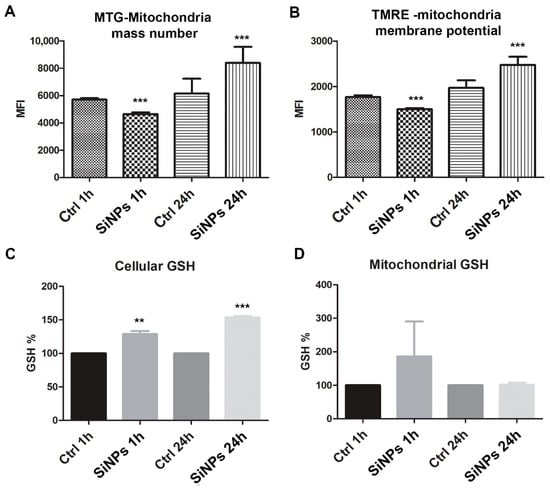 Assessment of mitochondrial features of isolated mitochondria from U937 cells incubated for short or long time with SiNPs. Quantification of mitochondrial mass with MTG staining (A) and mitochondrial membrane potential (MMP) △Ψm with TMRE (B) through flow cytometry analysis of control and treated cells for 1 and 24 h. Determination of cellular (C) and mitochondrial (D) glutathione (GSH) content in U937 cells incubated with NP for 1 h or 24 h by high performance liquid chromatography (HPLC). GSH content of untreated U937 cells was 35.0 ± 5 nmol/mg proteins in cells and 3.0 ± 0.55 nmol/mg proteins in mitochondria. Asterisks denote a statistically significant difference (** = p < 0.01, *** = p < 0.001) of treated compared to the relative control. At least 10,000 events were analyzed by flow cytometry for each experimental condition.