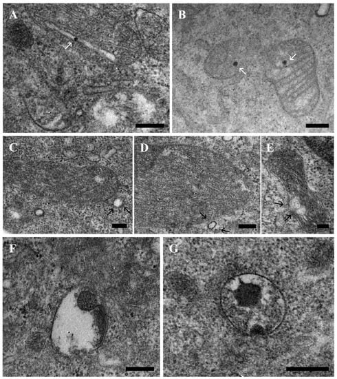 Ultrastructure of U937 cells incubated with SiNP. Electron-dense particles internalization in the mitochondria is present in (A,B). Small MDVs formation from mitochondria membranes is visible in (C–E). Transient (F) and complete (G) formation of endolysosomes is observable. A,D,E, bar = 100 nm: B,C,F, bar = 200 nm; G, bar = 250 nm.