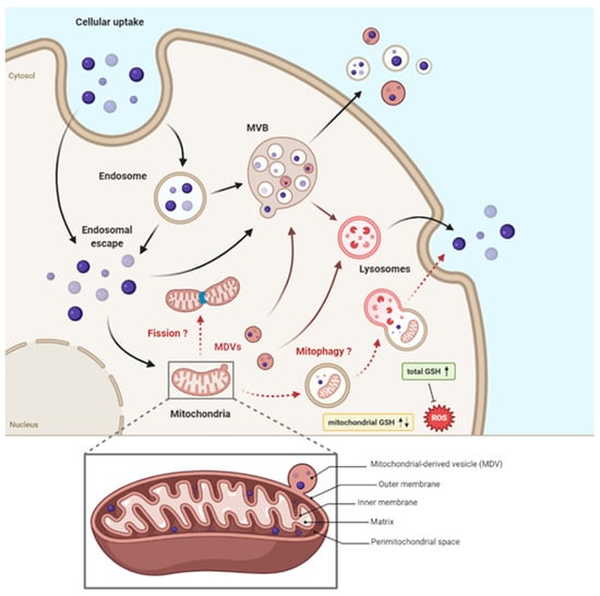 Schematic representation of SiNPs uptake in U937 cells and their intracellular trafficking, by highlighting the effects on mitochondria. Our previous data [] showed a colocalization with both lysosomes and mitochondria in U937 cells, indicating intracellular endocytic rehashing of SiNPs once inside the cells and transport to other organelles. Confocal analysis depicted the peripheral distribution of SiNPs, located in the peri-mitochondrial space (as illustrated in the enlargement of the mitochondrion). Flow cytometric data of entire cells and isolated mitochondria suggested the mitophagic process to eliminate damaged mitochondria full of SiNPs or either mitochondrial fission and/or mitochondrial-derived vesicles (MDVs) budding from mitochondrial outer membranes to free mitochondria from SiNPs. Although an initial ROS overexpression was detected, mitochondrial respiration was not substantially impaired. After 1 h, cells maintain the ability to synthesize GSH in the cytosol and its transport to mitochondria is not compromised, as we observed a higher amount of GSH in comparison to controls. Nevertheless, after 24 h of incubation with SiNPs, while total GSH is still higher than control cells in order to buffer ROS, mitochondrial GSH is slightly reduced. Finally, cells are able to release SiNPs both with vesicle or non-vesicle related secretion. (Image created with BioRender.com, accessed on 31 December 2020).