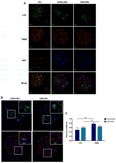 For doxorubicin-conjugated NP, we firstly defined DOX IC50 value on MCF-7 cells. Based on the literature, we titrated DOX by exposing cells for 24 h to different concentrations of drug and then assessed cell viability (Trypan Blue exclusion and PI test). We diluted DOX-NPs at the same concentration of drug (1 µg/mL), and, based on the fluorophores concentration of DOX-NPs, we calculated the dilution for COOH-NPs to be used as control. NP dispersions and DOX were prepared by diluting the stock solution, previously filtered with a 0.22 μm membrane filter (Euroclone SpA, Milan, Italy) under a sterile environment, into complete medium used for cell culture at room temperature (to ensure better NP dispersion), immediately prior to the treatment of cells. MCF-7 (105 cells/well) were seeded in MatTek glass bottom chambers (MatTek Ashland, MA, USA) and incubated for 24 h at 37 °C in a humidified incubator with 5% CO2. Then, the medium was removed and replaced with fresh medium containing free DOX (1 µg/mL), DOX-NPs (1 µg/mL of DOX) and COOH-NPs (diluted 1:50) and incubated for 4 h. The conditioned media were removed and cells were then washed twice with PBS 1X (10 mM NaPi, 150 mM NaCl, pH 7.3–7.4) and stained with different cellular markers. 100 nM of the acidotropic dye LysoTrackerTM Green (LTG) (Thermo Fisher Scientific, Waltham, MA, USA) incubated for 45 min was used to investigate the involvement of the lysosomal compartment []. Mitochondrial features were investigated by tetramethylrhodamine ethyl ester perchlorate (TMRE) (Sigma-Aldrich, St. Louis, MO, USA) 40 nM, a ∆Ψm-specific stain able to selectively enter active mitochondria, was added to the samples 15 min before the acquisition []. Confocal microscopy analyses were applied by a Leica TCS SP5 II confocal microscope (Leica Microsystem, Wentzler, Germany) with 488, 543 and 633 nm illuminations and oil-immersed objectives. The images were further processed and analyzed in ImageJ software (National Institutes of Health, Bethesda, MD, USA). Colocalization analyses were performed using JACoP plugin in ImageJ software (NIH, Bethesda, MD, USA) []. Pearson’s correlation coefficient (PCC) was used as the parameter to measure colocalization in our samples.
