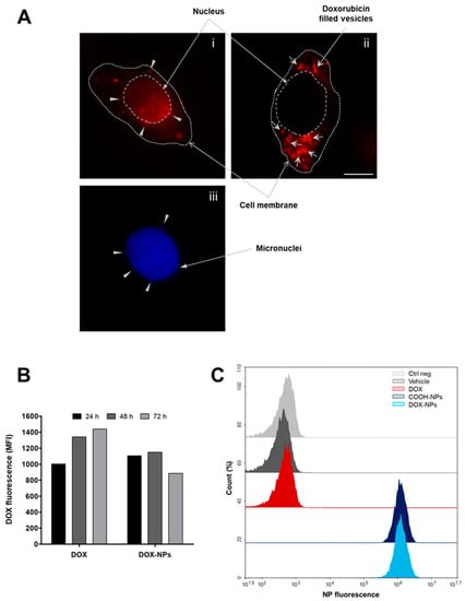 Intracellular accumulation and quantification of DOX in MCF-7 cells treated with DOX and DOX-NPs. MCF-7 cells were incubated with medium (Ctrl neg), DMSO (vehicle), COOH-NPs (diluted 1:50), free DOX (1 µg/mL) and DOX-NPs (1 µg/mL of DOX) for 24, 48 and 72 h at 37 °C. (A) Representative fluorescent microscopy images of MCF-7 cells incubated for 48 h at 37 °C with free DOX (1 µg/mL), mainly localized in the nucleus (i), and respective counter staining of nucleus with Hoechst (iii) or with DOX-NPs (1 µg/mL of drug), where red fluorescence indicates vesicles moved into the cytoplasm and perinuclear region (ii). Gray arrows highlight DOX filled vesicles, while small gray triangles indicate micronuclei containing DOX. Magnification 100× oil immersion. (B) Mean fluorescence intensity (MFI) of DOX from the flow cytometry data is shown as a function of time (n = 2). (C) Flow cytometry histogram overlay shows the NP fluorescence within MCF-7 cells after 48 h of incubation. At least 10,000 events were analyzed by flow cytometry for each experimental condition.