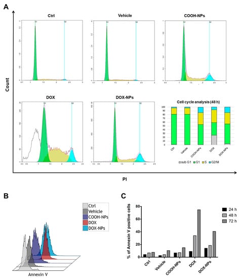 The distribution of DNA in the cell cycle was investigated by flow cytometry. MCF-7 (5 × 105 cells/well) were seeded in 6-well plates, grown for 24 h and, finally, exposed to a solution of free DOX (1 µg/mL), DOX-NPs (1 µg/mL of DOX), COOH-NPs (diluted 1:50) and DMSO (vehicle control) and incubated for different time points (24 and 48 h). After trypsinization cells were harvested, centrifuged at 1200 rpm for 5 min and washed twice with PBS 1X. The pellets were fixed drop by drop with ice-cold ethanol (70%) and stored at +4 °C, until the analyses. For cell cycle analyses, samples were washed twice with PBS 1X and each pellet was resuspended in 440 µL of PBS 1X, to which 10 µL of 1 mg/mL PI (Sigma-Aldrich, St. Louis, MO, USA) and 50 µL of 1 mg/mL RNAse (Sigma-Aldrich, St. Louis, MO, USA) were added, to reach a final volume of 500 µL. The samples were well resuspended and incubated at 37 °C for at least 30 min or at +4 °C until analysis by flow cytometry.