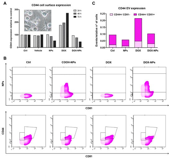 CD44 expression on cell surface and its expression on extracellular vesicles after DOX treatment. (A) MCF-7 were incubated with medium (Ctrl neg), DMSO (vehicle), COOH-NPs (diluted 1:50), free DOX (1 µg/mL) and DOX-NPs (1 µg/mL of DOX) for 24, 48 and 72 h at 37 °C, washed and then stained with CD44 RPE. Mean fluorescence intensity (MFI) data were acquired by flow cytometry and normalized to control (n = 2). (B) Flow cytometry contouring plots (above: NPs channel vs. CD81 FITC; below: fluorescence of particles CD44 RPE vs. CD81 FITC) of supernatants, presenting in pink CD81− particles or violet CD81+ particles. (C) The histogram shows the quantification of extracellular vesicles (EVs), counted using Dako CytoCountTM beads, in Ctrl, COOH-NP, DOX and DOX-NP media containing CD44+/CD81− and CD44+/CD81+ particles (n = 2). The color scheme is the same as contouring plots. At least 10,000 events were analyzed by flow cytometry for cells and at least 30,000 events for EVs for each experimental condition.