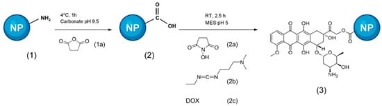 As depicted in Scheme 1, the conjugation of doxorubicin (DOX) to SiNPs required different steps. Firstly, we changed the functional group on the NP surface from -NH2 to COOH, in order to bind DOX. 2 mL of NPs were diluted with 222 µL of carbonate/bicarbonate 10X pH 9.5 and 1.2 mL of carbonate/bicarbonate 1X pH 9.5 and 10.9 mg of succinic anhydride (200 eq., 10 mg/mL in DMSO). The mixture was stirred for 1 h at 40 °C, in the dark and then concentrated with Amicon ultra 50 kDa (Merck Millipore, Burlington, MA, USA) and purified by means of size exclusion chromatography SEC, (Sephadex G25, GE Healthcare, Chicago, IL, USA) using water as eluent. The quantification of carboxylic groups on the surface was obtained using a colorimetric indirect method (see detailed protocol in Supplementary Information, Figure S6). COOH-NPs were dialyzed against 50mM MES pH = 5 for 24 h at 4 °C. 379 µL of NPs-COOH in MES were diluted with 500 µL of 50 mM MES pH = 5. 28.6 µL of 1-ethyl-3-(3-dimetilaminopropil) carbodiimide (EDC, 10mg/mL in DMSO), 21.2 µL N-hydroxysuccinimide (NHS, 10 mg/mL in ddH2O), and 0.5 mg of doxorubicin (10 mg/mL in DMSO) (Sigma-Aldrich, St. Louis, MO, USA) were added to the solution. The mixture was stirred for 2.5 h at RT, in the dark. The mixture was concentrated with Amicon ultra 50 kDa (Merck Millipore, Burlington, MA, USA) and purified by means of SEC (Sephadex G25, GE Healthcare, Chicago, IL, USA) using water as eluent. The product was analyzed by Agilent Cary 60 UV-Vis spectrophotometer (Agilent Technologies, Santa Clara, CA, USA), recording the whole spectrum. The efficiency of drug conjugation was then calculated using a direct method by measuring DOX linked to NPs by spectrophotometric analysis as depicted in Figure S7. SiNP physicochemical characterization was achieved as described in our previous study [] and summarized in Table S1.