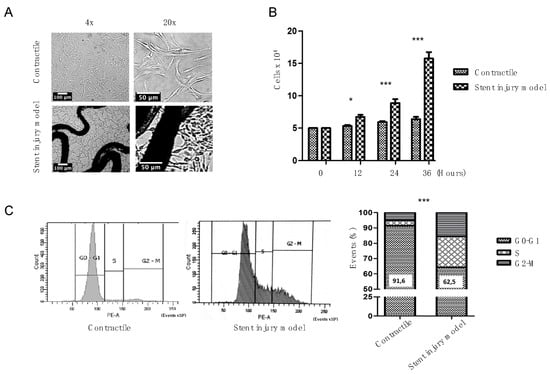 Phenotypic appearance of contractile HUASMC differs from HUASMC under stent injury model conditions. Panel (A) shows selected images from both conditions. Stent injury model cells proliferate at a significantly faster rate compared to contractile (B). While contractile cells show cell cycle arrest in G0-G1 phase (C), HUASMC exposed to stent injury model have a significantly higher proportion of cells in the S and G2-M phases. * p < 0.05; *** p< 0.001.
