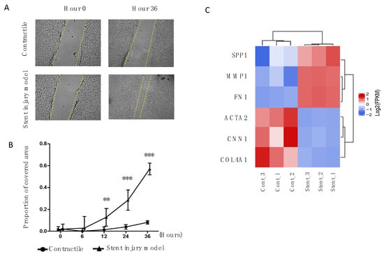 Cell migration was evaluated by wound healing assay, which revealed that the migratory capacity of HUASMC increased in the stent injury group (Figure 2A,B). Genes associated with a contractile or synthetic/proliferative phenotype are plotted in Figure 2C [,]. In the stent-stimulated group, there was lower expression of contractile phenotype-related genes such as smooth muscle α-actin (ACTA2), calponin (CNN1), and collagen type IV (COL4A1), whereas genes associated with the synthetic/proliferative phenotype, such as osteopontine (SPP1), matrix metalloproteinase 1 (MMP1), and fibronectine (FN1), were upregulated.