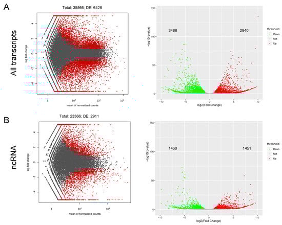 MA scatter plots of sequencing data assessing overall distribution of the two datasets. Expression pattern of all transcripts (A) and non-coding transcripts (ncRNA) (B). Labeled red dots indicate differential expression (≥two-fold change and FDR ≤ 0.05); volcano plots reflect number, significance, and reliability of differentially expressed transcripts; red dots; and green dots indicate upregulation and downregulation, respectively. The x-axis represents the value of log2 Fold change and the y-axis represents the adjusted FDR.