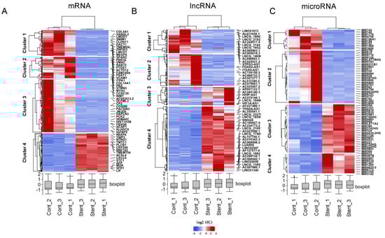 Hierarchical clustering using stringent criteria for DE mRNA (A), DE lncRNA (B), and DE microRNA (C); sample clusters are included above the heatmap and clusters of DE transcripts are noted on the left of each heatmap. Red and blue represent upregulated genes and downregulated genes, respectively. The lower boxplots depict the distribution of each sample gene’s expression. Cont_ = Replicates with contractile HUASMC; Stent_ = Replicates with stent-injured HUASMC; DE: differentially expressed.