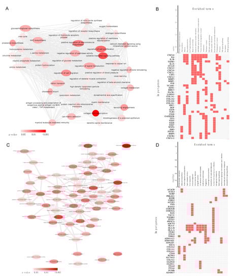 Gene ontology analysis and functional enrichment of KEGG terms for differentially expressed mRNA (panels (A,B)) and mRNA cis-target of differentially expressed lncRNAs (panels (C,D)); color intensity depicts significance, while ellipse size represents the number of genes.
