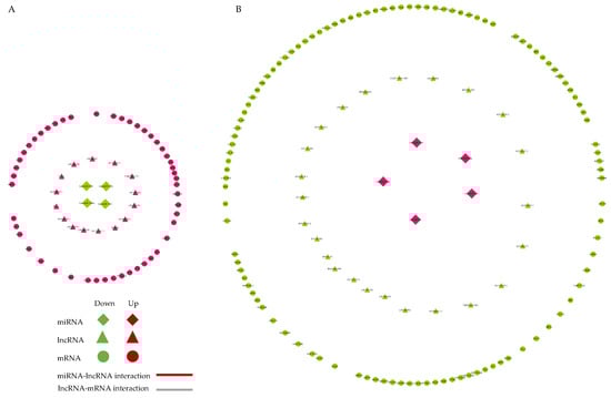 According to the ceRNA theory, a pair of co-expressed lncRNA and mRNA compete for miRNA target sites; therefore, lncRNAs serve as endogenous sponges that target one or more miRNAs, affecting the post-transcriptional regulation of mRNAs. The ceRNA network was constructed with 1241 interactions comprising 9 miRNAs, 39 lncRNAs, and 158 mRNAs; 4 downregulated miRNAs interact with 15 upregulated lncRNAs and 49 upregulated mRNAs (Figure 6A). Meanwhile, 5 upregulated miRNAs interact with 24 downregulated lncRNAs and 109 downregulated mRNAs (Figure 6B).