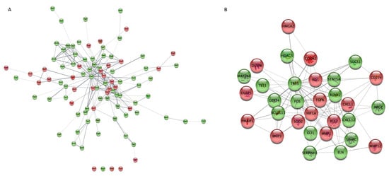 PPI network representation of 150 mRNAs involved in the ceRNA network (panel (A)); The network was created by STRING and visualized in Cytoscape. Hub protein network (panel (B)) according to CytoHubba MCC coefficient. Red and green represent upregulated and downregulated proteins, respectively; circle size represents MCC score. PPI, protein–protein interaction; ceRNA, competing endogenous RNA.