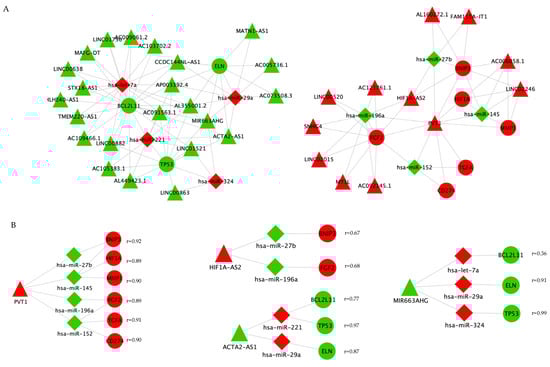 The lncRNA–miRNA–mRNA ceRNA network representation of upregulated (panel (A)) and downregulated (panel (B)) lncRNAs. Diamonds, triangles, and circles represent miRNAs, lncRNAs, and mRNAs, respectively. Red and green represent upregulated and downregulated RNAs, respectively, in the stent-induced injury cellular model. Red and grey lines indicate miRNA–lncRNA and lncRNA–mRNA interactions, respectively. ceRNA, competitive endogenous RNA; lncRNA, long non-coding RNA; miRNA, microRNA; mRNA, messenger RNA.