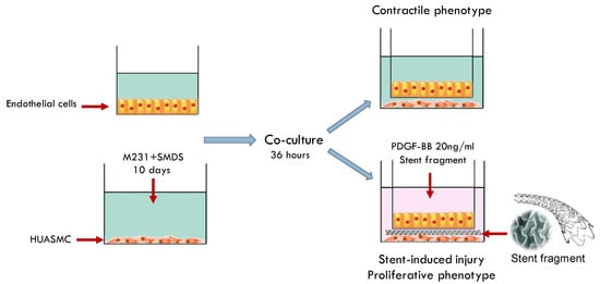 Co-culture system of human umbilical artery smooth muscle cells (HAUSMCs) and endothelial cells with M231 medium plus Smooth Muscle Differentiation Supplement (SMDS). Endothelial cells were seeded on inserts of 0.4 mm pore size in a no-touch manner. For the stent injury model, a piece of bare metal stent was set gently over the HUASMCs. Platelet-derived growth factor (PDGF-BB) 20ng/mL was added to conditioning media.