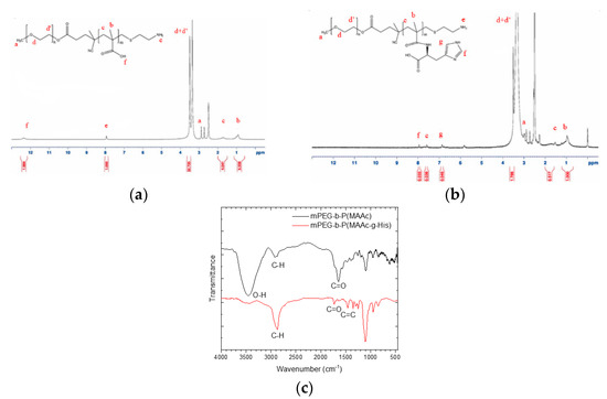 Characterization of synthesized copolymers. 1H–NMR spectrum of (a) mPEG–b–P(MAAc) –NH2 copolymers and (b) mPEG–b–P(MAAc–g–His) –NH2 copolymers. (c) FT–IR spectra of copolymers (n = 3, showing one measurement in the data).