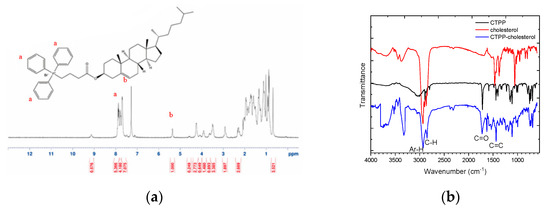 Characterization of synthesized CTPP–cholesterol. (a) 1H–NMR spectrum, (b) FT–IR spectra, and (c) ESI–MS spectrum of CTPP–cholesterol (n = 3, showing one measurement in the data).