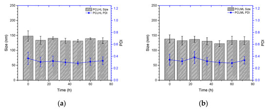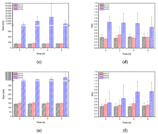 To understand the stability of polymer–liposome complexes formed via electrostatic interaction, these complexes were treated with PBS at pH 7.4 and 37 °C under continuous shaking. Any changes in the particle size and size distribution were measured by DLS. As shown in Figure 5a,b, both PCLH and PCLM were stable and maintained their properties even after 72 h of treatment, which indicates that copolymers on polymer–liposome complexes could stabilize their nanostructures. PCLH and PCLM were treated with PBS at pH 6.5 and 5.0 at 37 °C to understand the pH-responsiveness and behavior of polymer–liposome complexes when they were in early and late endosomes. The pKa value of the imidazole ring for histidine is 6.3 [25]. A portion of histidine on mPEG-b-P(MAAc-g-His)-NH2 copolymers was protonated to obtain positive charges at pH 6.5 and neutralize the negative charges of the copolymers. However, cationic liposomes did not afford any pH-responsiveness. Therefore, the liposomes still maintained their particle sizes and size distributions at pH 6.5, even though the copolymers desorbed from the surface of cationic liposomes (Figure 5c,d). Conversely, most histidine molecules afforded positive charges and caused intramolecular and intermolecular electrostatic interactions with carboxylic acid (pKa value at approximately 1.8) at pH 5.0, thereby causing PCLH aggregation. In contrast, because PMMAc has a pKa of approximately 4.8 [26], mPEG-b-P(MAAc)-NH2 copolymers tightly coated on cationic liposomes at pH 6.5 and formed intramolecular and intermolecular hydrogen bonds to increase the particle sizes (Figure 5e,f).