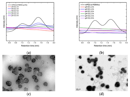 Copolymer desorption and morphology changes of polymer–liposome complexes at low pH. GPC analysis of polymer–liposome complexes coated by (a) mPEG-b-P(MAAc-g-His)-NH2 and (b) mPEG-b-P(MAAc)-NH2 copolymers. TEM images of polymer–liposome complexes coated by (c) mPEG-b-P(MAAc-g-His)-NH2 and (d) mPEG-b-P(MAAc)-NH2 copolymers at pH 5.0 for 6 h (n = 3, displaying one of the measurements from the data).