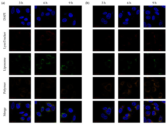 Endosomal escape of polymer–liposome complexes. Confocal images of (a) PCLH and (b) PCLM after co-incubation with MCF-7 cells for 3, 6, and 9 h. Scale bar: 20 μm (n = 3, showing one of the measurements from the data).