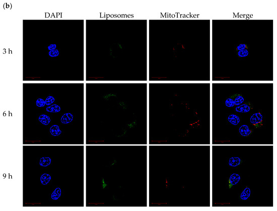 CLSM was used to monitor the mitochondrial-targeting ability of PCLH and PCLM. Cancer cell mitochondria and cationic liposomes were labeled with MitoTracker and FITC, respectively. For PCLH (Figure 8a), the intensities of FITC and MitoTracker were merged together after 3 h, indicating successful mitochondrial-targeting of cationic liposomes after desorption from mPEG-b-P(MAAc-g-His)-NH2 copolymers and evading from endosomes. For PCLM (Figure 8b), although FITC intensity of cationic liposomes was also overlapped with mitochondria (MitoTracker) at 3, 6, and 9 h because anionic copolymers could improve mitochondrial targeting [27], the FITC intensity of PLCM at mitochondrial was lower than that of PCLH, demonstrating that the mitochondrial-targeting ability of PCLM was weak.