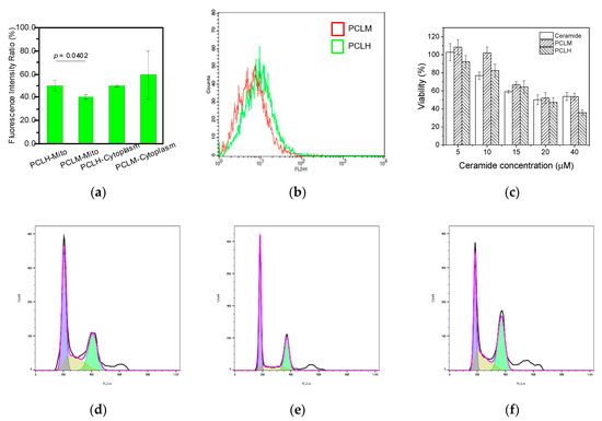 Because ceramide in the mitochondria is known to increase the production of reactive oxygen species (ROS) and cause mitochondrial damage [28], the levels of ROS in MCF-7 cancer cells were investigated to understand the targeting effect after the cells were treated with PCLH and PCLM for 24 h. As shown in Figure 9b, PCLH was expected to produce higher levels of ROS (around 1.1-fold) in the mitochondria of cancer cells than PCLM because of the efficient mitochondrial-targeting ability of PCLH. On the other hand, since PCLH showed endosomal escape and mitochondrial-targeting ability, both PCLH and PCLM were incubated with MCF-7 breast cancer cells to understand whether PCLH could cause higher toxicity than PCLM. After co-incubation for 24 h, both PCLH and PCLM showed similar cell viability at low concentrations of ceramide. However, PCLH showed higher toxicity than free ceramide at high concentrations of ceramide (Figure 9c), indicating a therapeutic benefit by concentrating ceramide in the mitochondria. In contrast, the cytotoxicity of PCLM was lower than that of PCLH owning to the lack of endosomal escape and mitochondrial-targeting for PCLM. The results of cytotoxicity demonstrate that the half maximal inhibitory concentration (IC50) value of PCLH was about 20 μM, while the values for free ceramide and PCLM were above 40 μM. Finally, cell-cycle analysis was evaluated using MCF-7 breast cancer cells after treating with PCLH and PCLM. The experimental results show that both PCLM and free ceramide caused 40% of MCF-7 cells to be arrested at the G1 phase (Figure 9d,e). In contrast, PCLH induced more than 46% of MCF-7 cells to be arrested at G2/M phase, and MCF-7 cells arrested at G1 phase decreased to 32%. (Figure 9f).